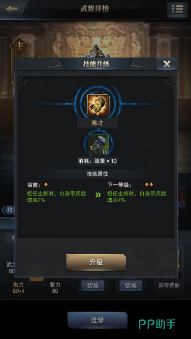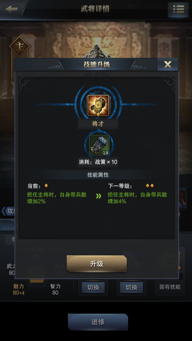 当然武将的某些特殊的技能也可以提高带兵数量的。例如每一个主公都会有的一个技能叫做将才,担任部队的主将就可以提高自身的带兵数。通过用战策的升级将才技能,也可以使将才技能的等级提高,从而提高带兵数。
