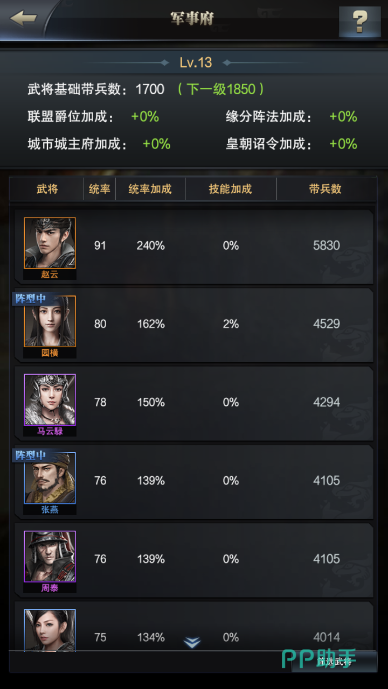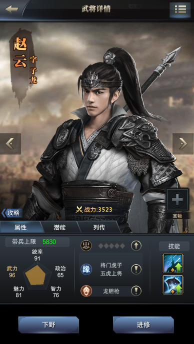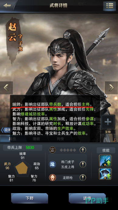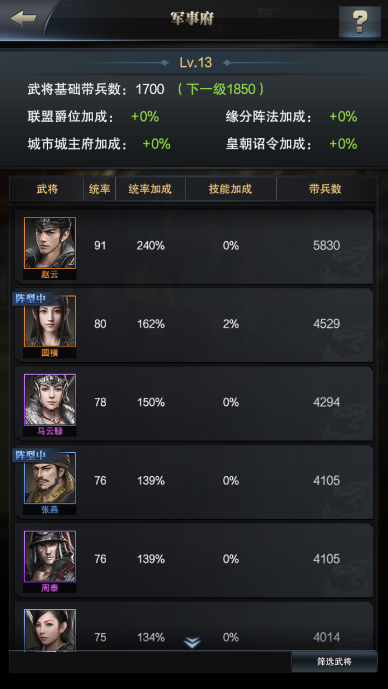 这里我选用的是一个橙将赵云,带兵上限有5830。但其实每个武将不同的带兵上限,也就是跟武将的统帅能力有关。选用这个高统帅能力的武将担任部队的主将的话,就能提升出征部队的带兵数了。