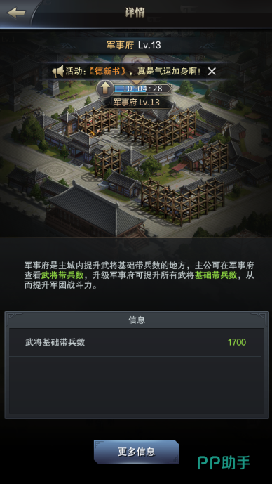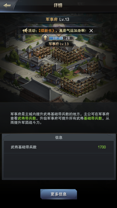 除此之外,游戏还有一个很重要的建筑可以影响武将的带兵数。那就是军事府。军事府的等级越高,每个武将的带兵数量就越多,也就是说带兵数跟军事府的关系是成正比的。除此之外在军事府里面还可以看到很多可以影响带兵数的一些因素。