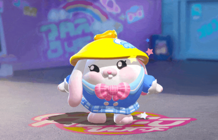 这款皮肤的主要形象是围绕着一只白白胖胖的粉色小兔子。小兔子头上戴着一顶黄色的帽子,穿着格子裙校服,因为今年是兔年对应上了这个主题。