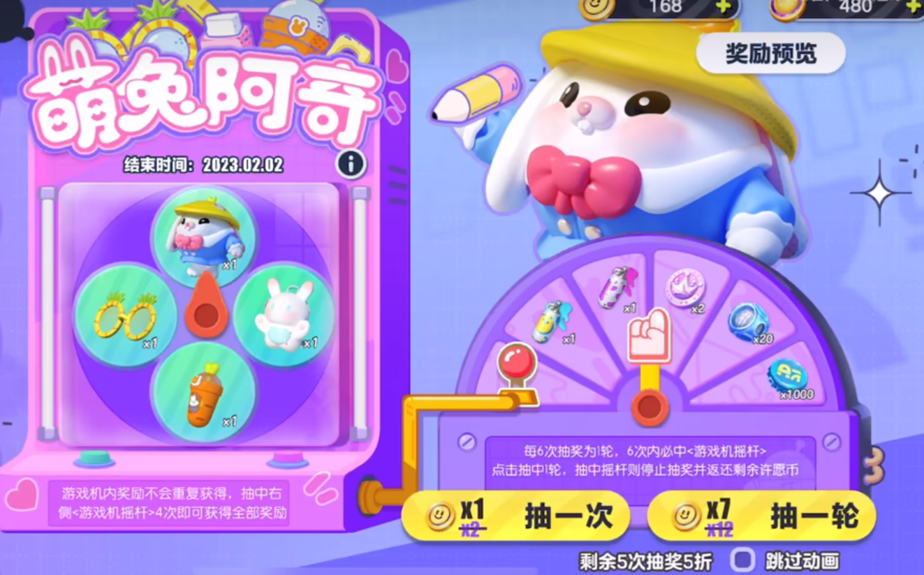萌兔阿奇返场的奖池抽奖标准依旧是使用的游戏机摇杆加游戏机两部分。玩家需要先投币,在游戏机摇杆中抽取六个不同的物品,直到抽取到可以进入游戏机的货币。玩家抽取到游戏机货币之后,游戏机就会转动。游戏机中一共有四个商品,萌兔阿奇皮肤本身加上眼镜背包以及饰品。