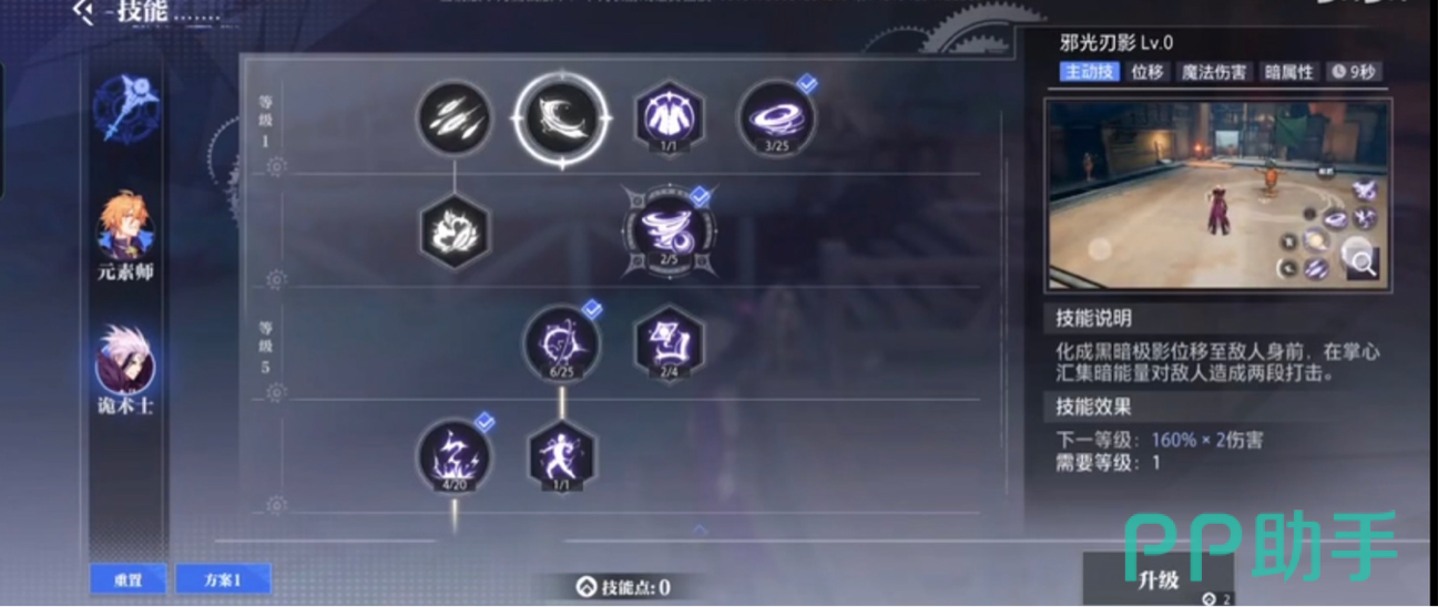二技能邪光刃影:化成黑暗极影位移至敌人身后,在掌心汇集暗能量对敌人造成两段打击。