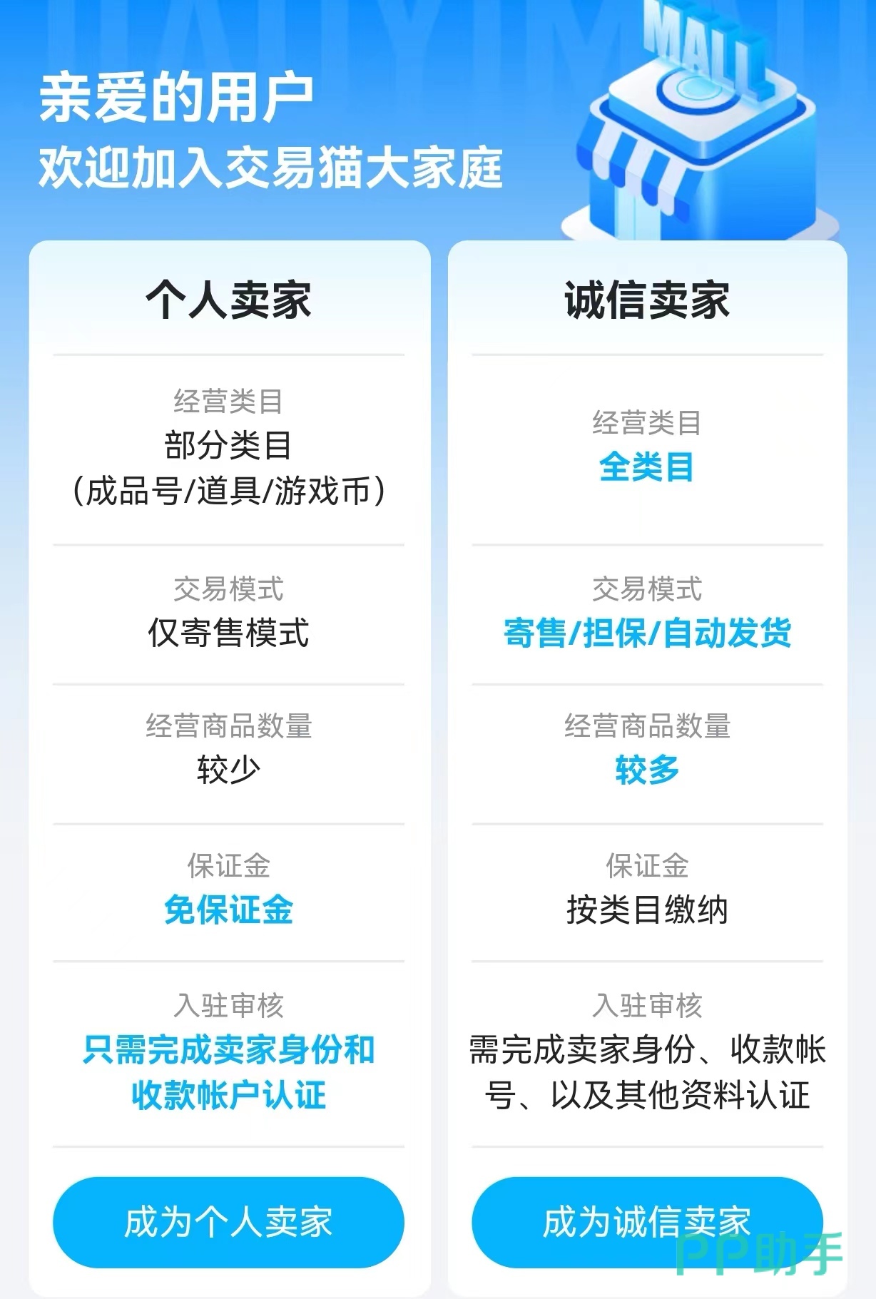 要在交易猫卖号首先需要认证成为一名商家,小编建议选择认证诚信卖家更加划算,只需要达成4个要求即可,只要你是守规则的用户这四点都是信手拈来,完成后上架商品的排列可以更靠前,能被更多的买家看到下单成功率也更高。
