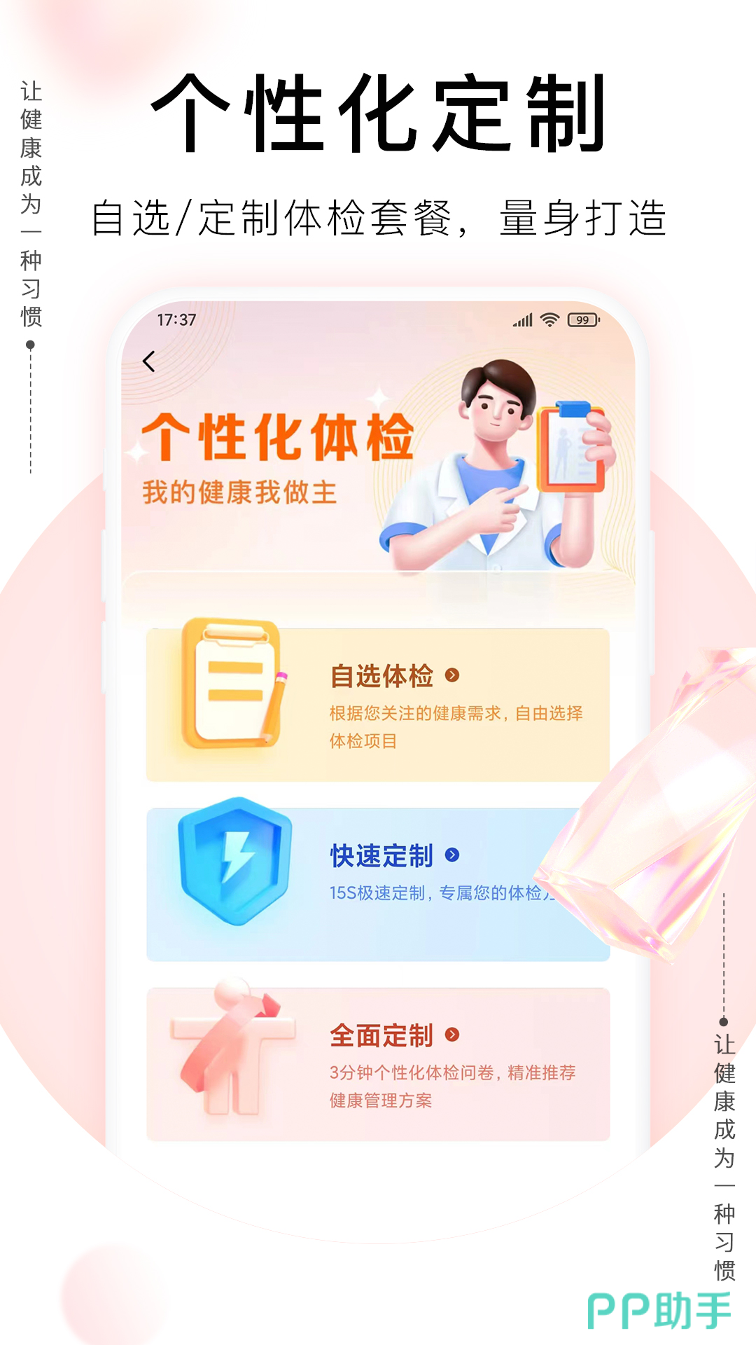 作为个性体检工具,软件针对不同用户定制体检套餐,在三分钟之内定制方案,快速预约体检项目,线上查看体检报告,由专家免费解读各项数据,掌握身体情况。