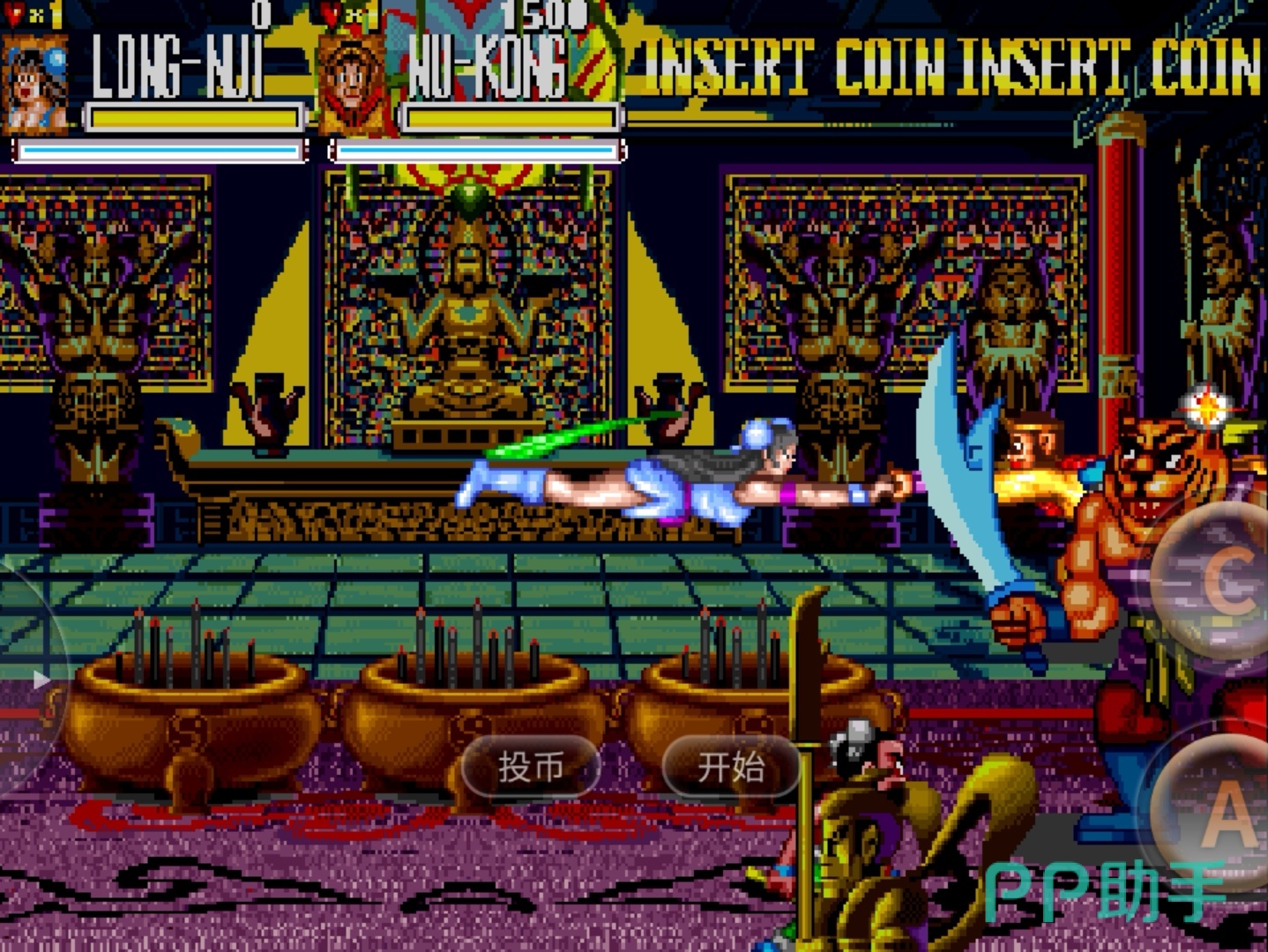 a为普通攻击,C是打开宝物栏,CA的具体方法为:a一下,然后收招时按C再紧接着a,C和后一个a之间衔接越快越好,但注意别同时按下了,在实际战斗时连续a、Ca就可以了。当场上有三个小兵的时候,a一下后不要太快按C,a会有延迟。