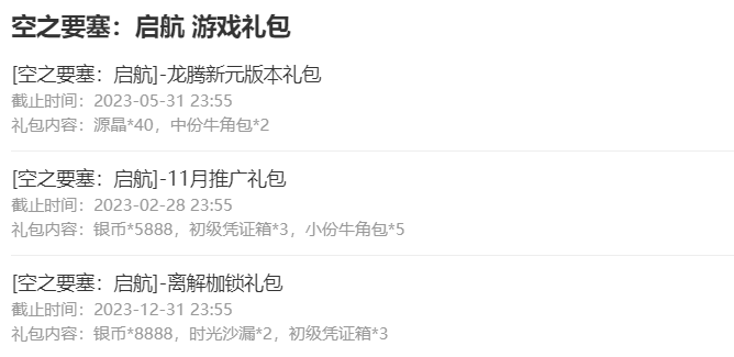 很多玩家是不是都想知道空之要塞启航礼包兑换2023有什么,众所周知游戏当中有很多的免费礼包获取的方法差异巨大,肯定是有很多的玩家好奇如何获取这些吧,接下来就为大家分享一下最新的礼包情报,大家还没有领取的火速去领取吧,里面可是有着一大波的奖励内容的。