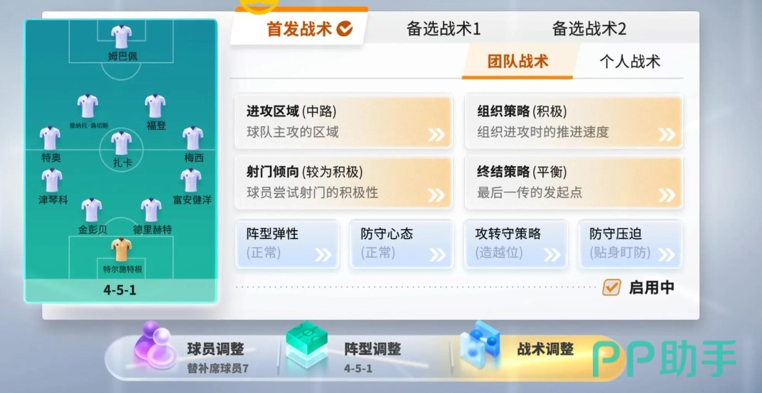 前锋推荐用姆巴佩,前场桑切斯、福登,中场特奥、扎卡、梅西,后场用津琴科、富安健洋,后卫用金彭贝、德里赫特,守门员用特尔施特根。整个团队主攻中路区域,积极推进,球员积极尝试射门。在阵型弹性、防守心态方面都选择正常,攻转守策略以造越位为主,防守压迫采用贴身盯防。而在个人战术方面,以姆巴佩为例,选择埋伏在禁区附近,搭配冷静施射、远程火炮、花式过人来力图攻破对方防线。