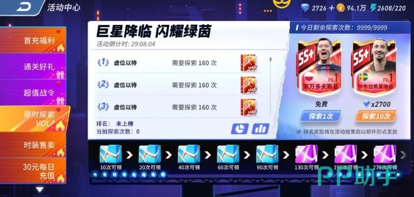 介绍玩球员、阵型,我们顺便来讲讲新人玩这个游戏需要注意的一些事项。游戏公测后会有一个“限时探索”活动,每一期持续3填,主题包括2个SS加球员,能够抽取限时礼包和道具获得球员碎片。这个游戏单抽需要300钻,十连2700,每天有一次免费抽奖的机会。活动结束后还会对累计抽卡的次数做一个排名,前1到50名会有对应奖励。这里说下内测5期活动的球员,当然公测可能会有变动,所以仅供参考。第一期是边锋萨拉赫(得分)、内马尔(全能),第二期守门员诺伊尔(团队)、德赫亚(扑球),第三期中场莫德里奇(平衡)、坎特(防守),第四期中锋莱万(得分)、伊布(得分),第五期后卫什克里(干扰)、博努奇(团队)、尼亚尔。