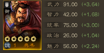 虽然典韦所带的兵种是偏向防御的盾兵,但他最高的并不是统率,虽然统率的成长数值也达到了每级3点,但远不及基础数值91,且成长数值高达每级3.64的武力,这就意味着在盾兵中典韦有着不错的伤害,其自带的两个战法来看也印证了这点,第一战法“古之恶来”不仅能为友军提供援护,而且还有着提升自身免伤和反击敌人的被动,反击伤害在升满后高达82%,且每回合可触发最多三次。