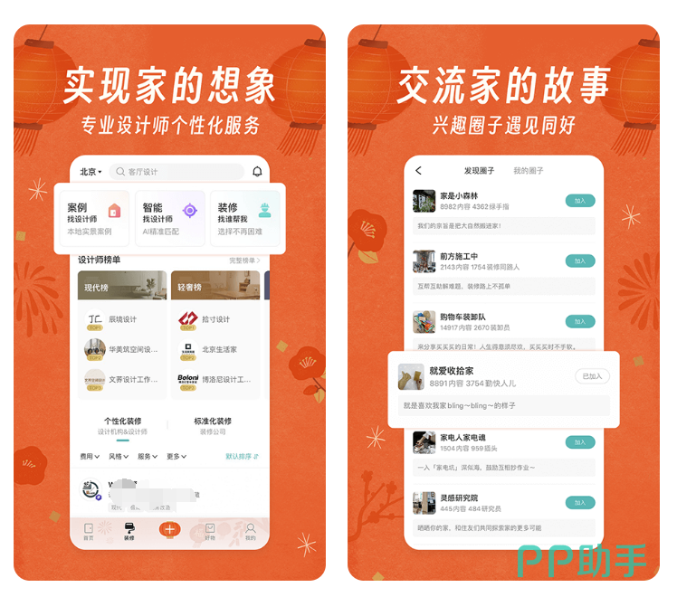 手机专属的家居消费交流平台,这里有各种不同户型的装修经验分享出来。一同加入进来就能够找到相同爱好的朋友,大家一起聊聊关于装修的故事,最后不断的学习成为自己的理想居住状态。