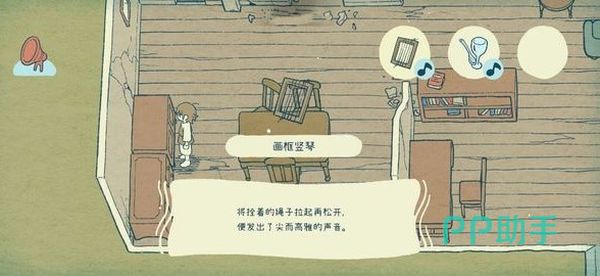 然后来到客厅中在沙发的旁边有一个倒在地上的画框,大家可以把它给捡起来,接着再往里面走,在最左侧的餐桌上面把红酒杯勺子放到一起,就组成了杯钟,接着使用刚刚在沙发旁边捡到的画框和最左侧桌子上的针线变成画框竖琴。