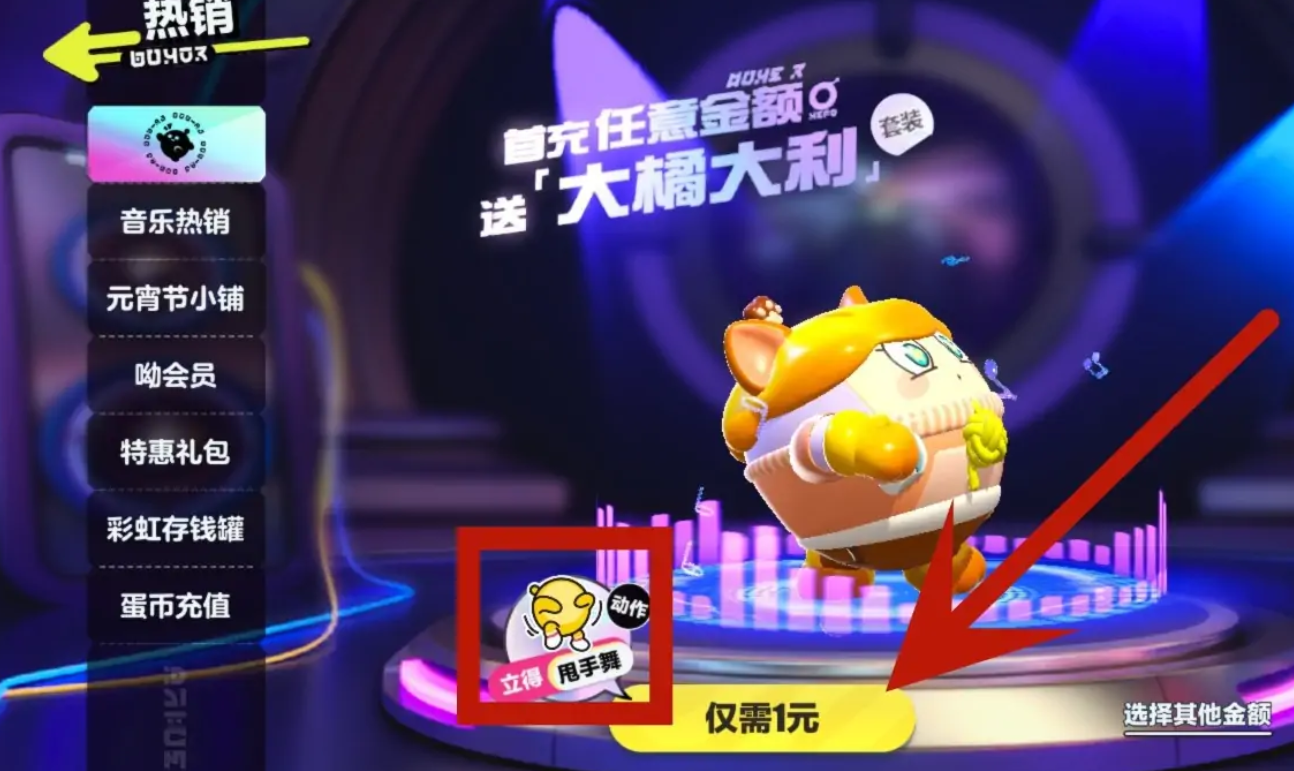 在游戏当中获取甩手舞是不需要金钱充值购买的。玩家想要获得甩手舞的话,首先要进入蛋仔岛,点击上方热卖按钮,就可以获得哦。点进去后,首充优惠就会出现在没有充值的蛋仔身上。