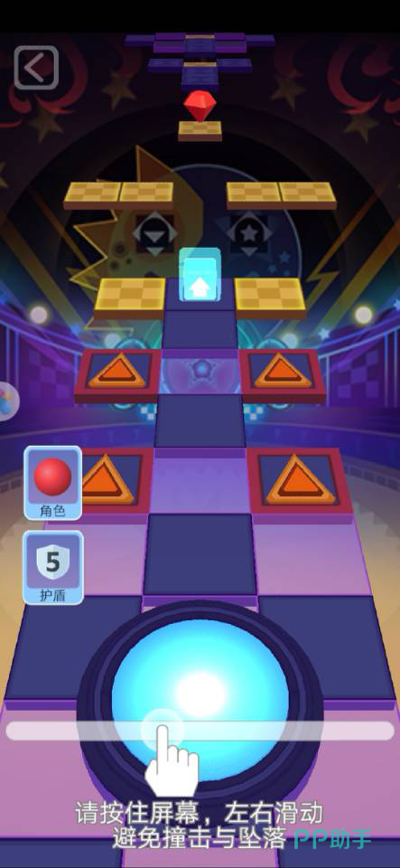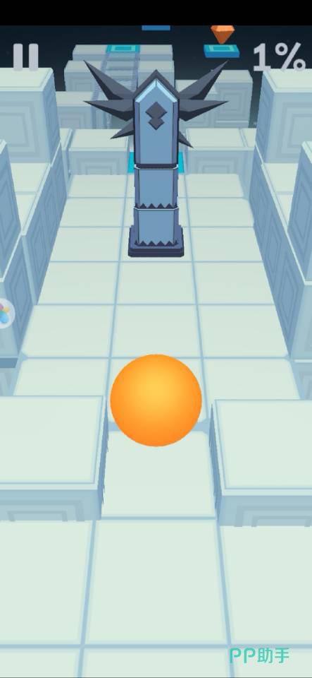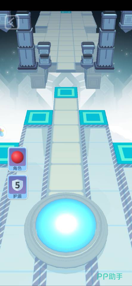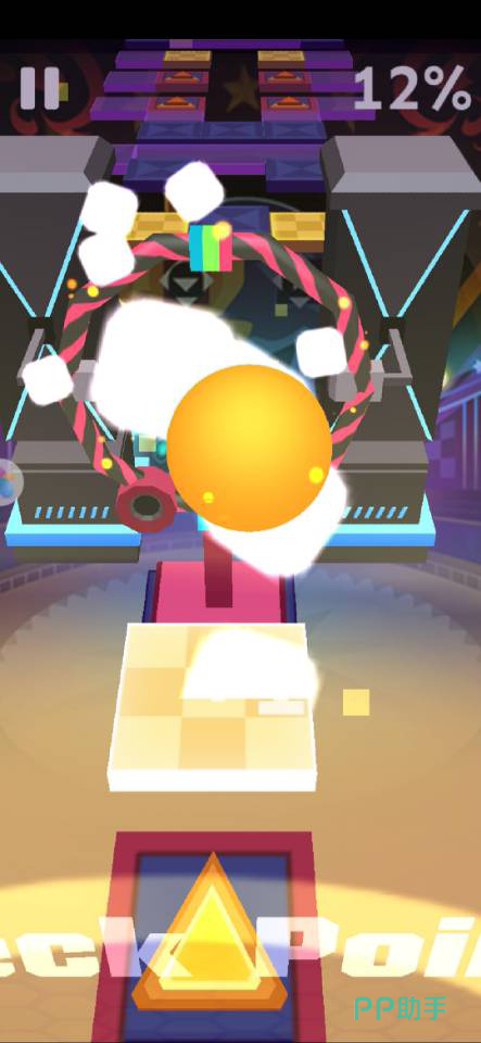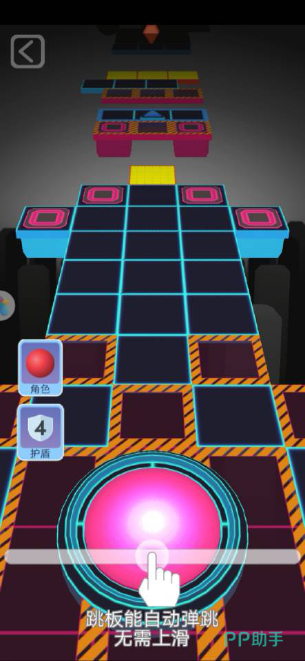 开局时球会在下方圆圈处弹跳出来,这时候我们按着屏幕控制左右来躲避障碍物和陷阱,在空档处找到跳板弹跳即可。像上图中的最前方的黄色方格前方出现了无地板现象,这时候就需要球的跳跃,不然会掉下导致失败,所以找寻跳板很重要。