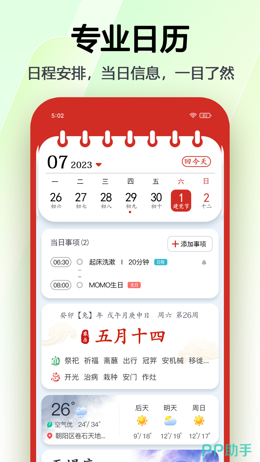 具有功能齐全,体积好,打开速度快优点。只要锁定日期,随时能查看当天黄历和农历,以及所属节假日和节气,还支持查看天气,并且将天气变化改造成背景,以及进行其他主题方面的私人定制。