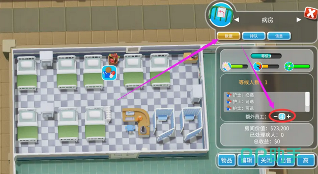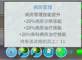 在游戏中,给骨科病房配置的护士需要三类执照,分别为治疗执照、诊断执照,以及病房管理执照,想要同时在病房配置这三种护士,那么每种护士起码要两个,这样很浪费资源。实际上大家可以只配备四个护士就足矣——病房管理技能的加成其实已经兼顾了三种能力,只要将这个技能升满即可。