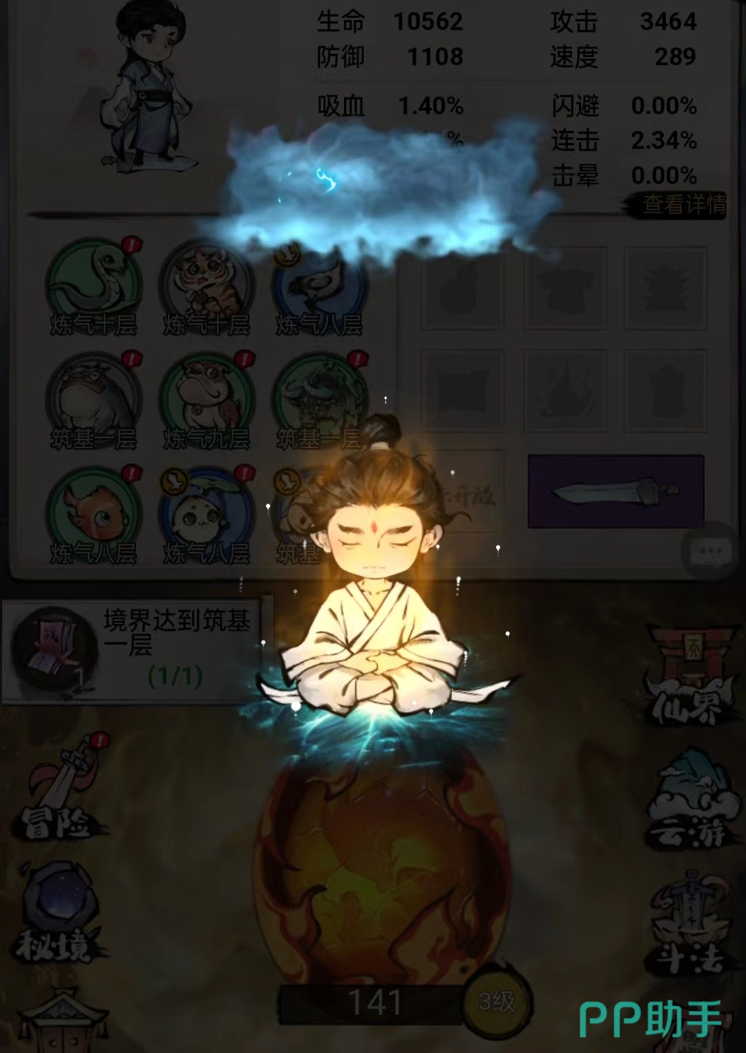 游戏的核心玩法就是通过孵蛋增强等级战斗力,装备属于辅助玩法,当完成主线任务解锁秘境悬赏玩法后可以通过抓捕江洋大盗获得装备奖励。仙盟功能解锁后一定要尽快加入一个仙盟,升级孵化池需要一定的时间,有了仙盟可以选择求助盟友,大大减少了升级的时间。野外首领一定要打满,这个是最快补充异兽蛋的方式,在这个游戏中没有了异兽蛋就什么都做不了。佩戴不同的飞剑可以提升基础属性,建议佩戴莲台或者赤霄,可以忽视击晕和暴击。