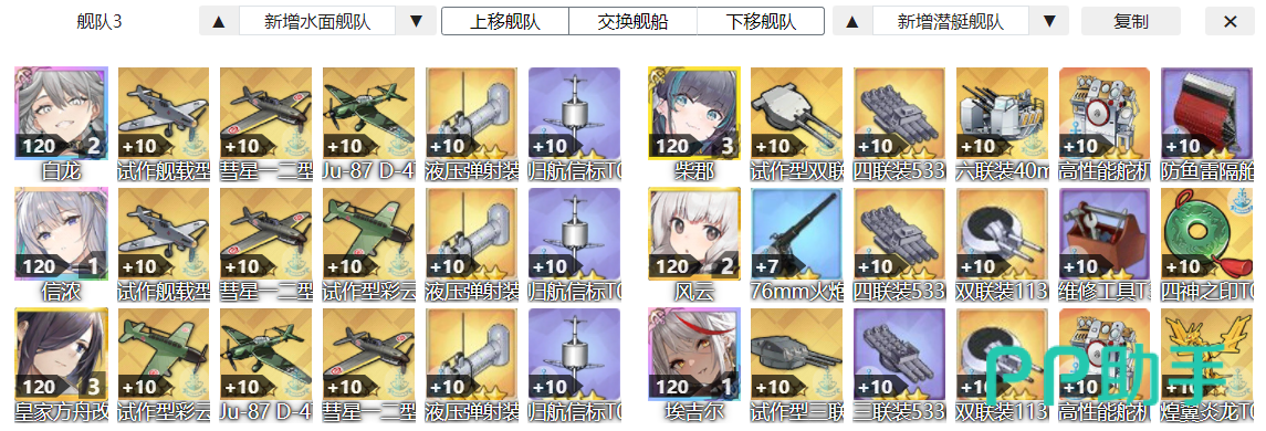 接着是航母队的选择。前排配置是柴郡+风云+埃吉尔,其配装和炮队前排基本一致,保证其生存能力即可。后排选择白龙+信浓+皇家方舟,舰载机以彗星一二型甲,以及试做型彩云为主,二者搭配打时间差,有着相当不错的压制能力。