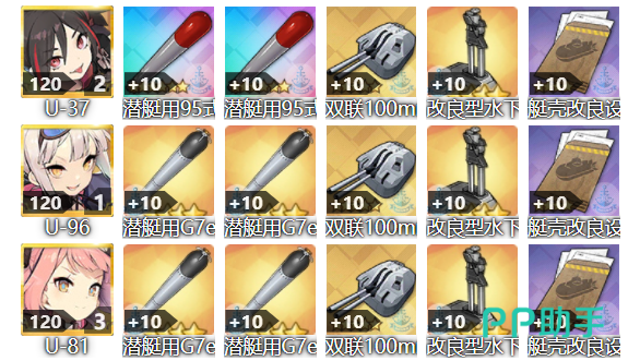 潜艇队的选择相对比较特殊,由于这个舰种并没有前后排的区分,因此只要一艘旗舰,一艘上僚舰,以及一艘下僚舰即可组成一队,目前主流队伍分为U艇以及白鹰队两种组法。U艇队选择U37作为旗舰,上僚舰为U96,下僚舰为U81或U47;白鹰队则是棘鳍旗舰,射水鱼上僚舰,鹦鹉螺下僚舰,鱼雷都推荐上G7e即可。