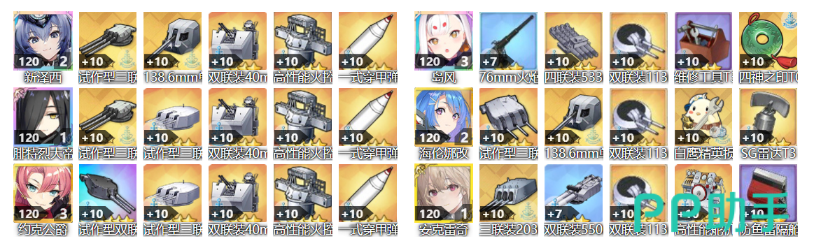 首先是炮队,前排建议带岛风+海伦娜+安克里奇的组合,除了常规的武器配备外,岛风带维修工具和四神之印;海伦娜带白鹰损管和sg雷达;而安克雷奇则需要配备高性能舵机,以及防鱼雷隔仓。后排选择新泽西+腓特烈大帝+约克公爵的组合,弹药选择穿甲弹。可以看到这套阵容并非是单势力炮队,但泛用性极佳,放在任何环境都可以胜任,是自律挂机的不二之选。