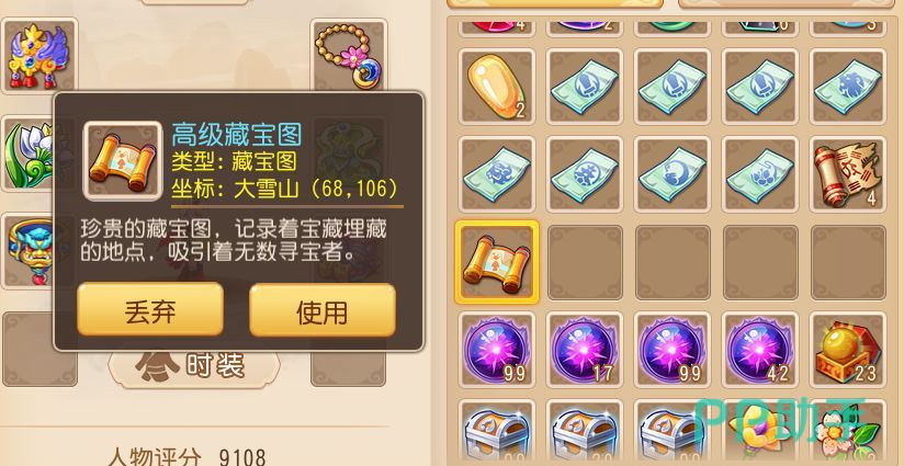 当玩家收集了五件宝贝将其带到偷偷怪处(傲来渔港)转换为高级宝藏地图后,可以点击“使用”进入高级宝藏地图所在的地图。但与普通的藏宝图不同,系统不会自动将玩家带到特定的位置。而是屏幕左上角会出现一个小指南针图标。玩家每次移动一定的距离,指南针就会相应地改变方向。跟随指南针就能找到宝藏地点。