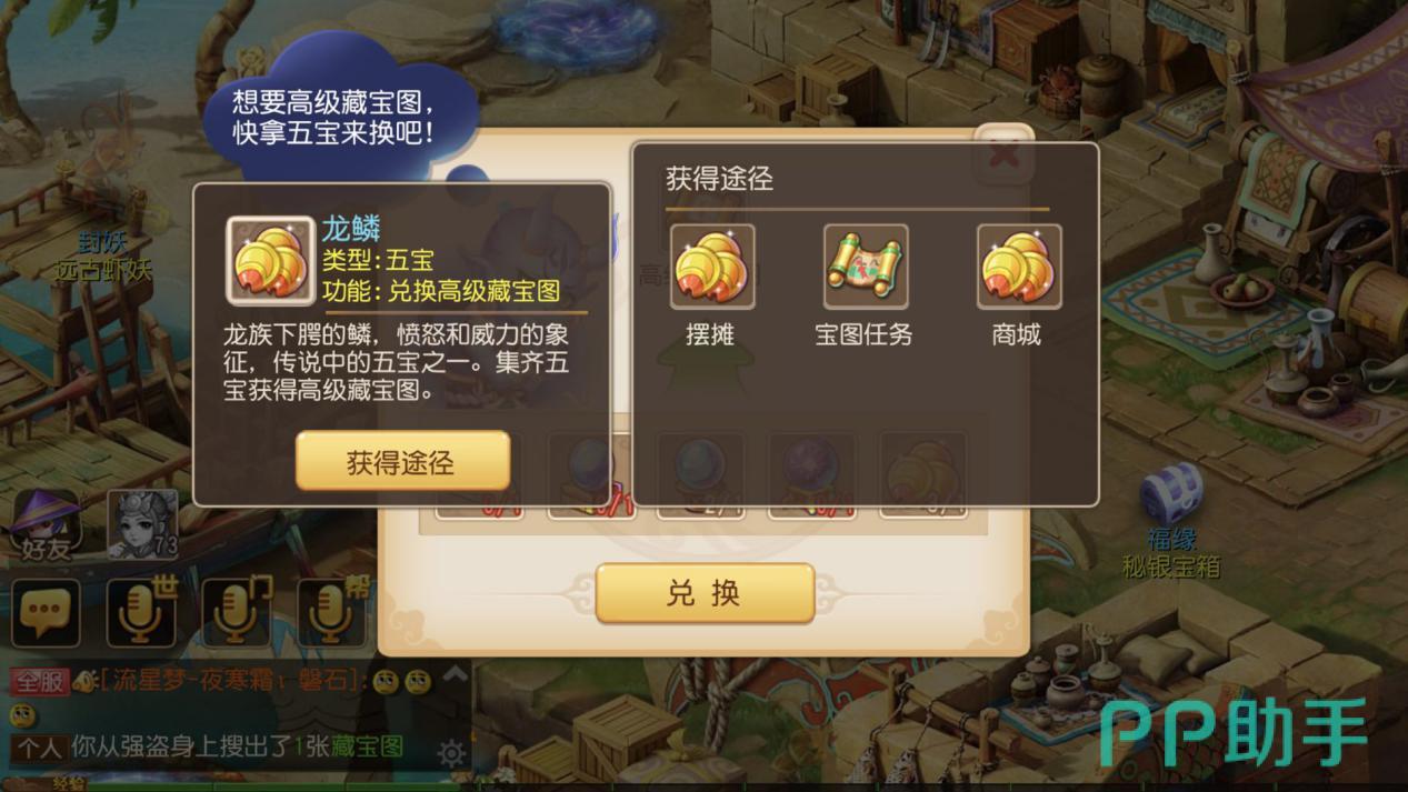 夜光珠和龙鳞获取方式跟其他宝物类似,可以商会和摆摊购买、节日活动掉落、挖普通藏宝图获得。但是小编觉得龙鳞和夜光珠相对容易获得。因为挖普通宝图掉落概率较大,所以购买的价格并不是特别贵,商会的价格是固定的,而摆摊出售价格根据玩家自行定价。所以建议如果想购买的玩家可以对比下商会和摆摊的价格,避免多花银子,不过土豪请随意。