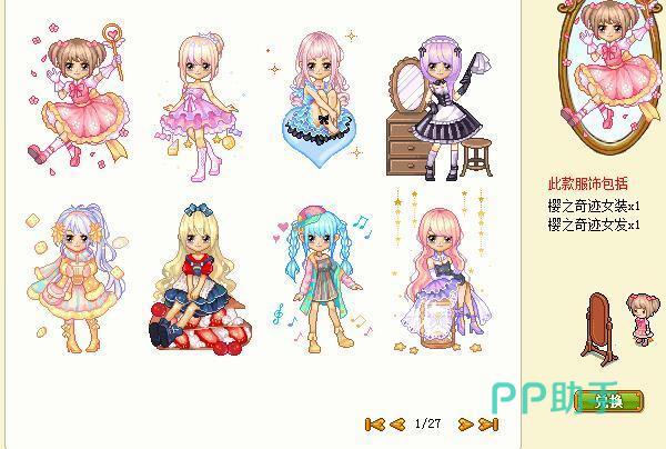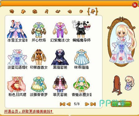 皮卡堂中都有属于玩家自己的衣橱,玩家可以根据自己的审美和喜好来进行搭配,服装风格样式非常多样,无论是可爱风格还是华丽风格的服装都非常好看,玩家的选择非常多,像下图中的粉色日风裙和冰雪王女套装就非常可爱,黑猫套装就很优雅华丽。还有一些比较独特带有主题的服装,比如开心牧场和蝙蝠魔导师。