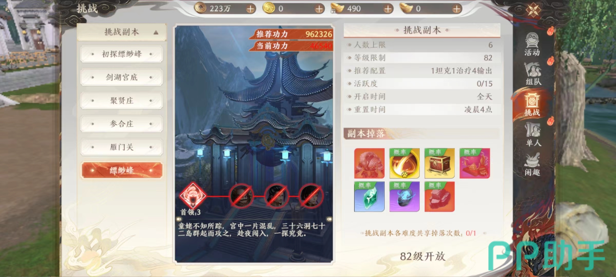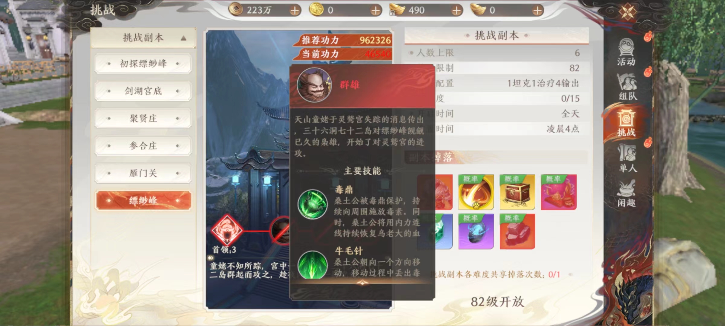 这是达到82级才会开放的挑战副本,建议功力指数达到96万左右再来战斗,这样才能扛住 boss所造成的群体伤害,不然即使肉盾治疗再给力输出,打不掉也是很难通关的。第1个面对的是七十二岛的群雄角色,主要作战对象有三个,分别是桑土公,乌老大和欧岛主。对于桑土公来说,会向周围不断释放毒素,并且利用自身内力不断给乌老大加血,这是比较难受的地方。