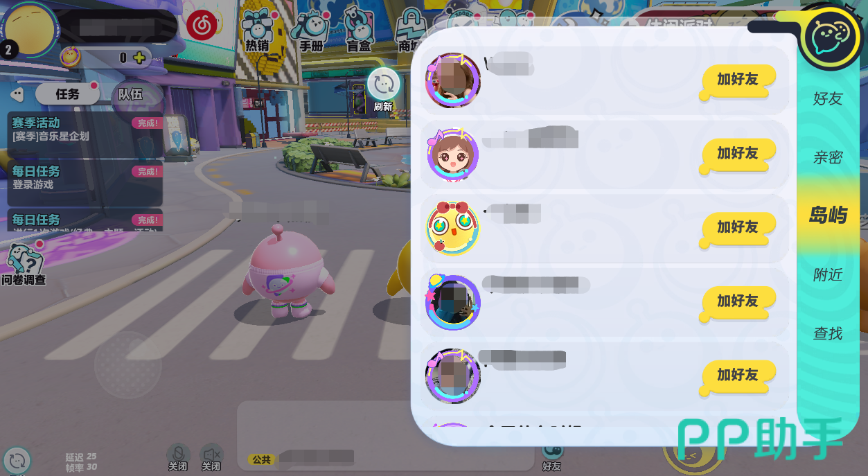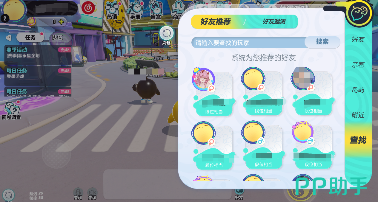 那就是打开好友栏,然后点击右边的“查找”选项,之后这里就会默认出现一个好友推荐的页面,这里面记录了一些系统认为适合与你当好友的玩家,其中一些玩家是段位相当给你推荐的,但也有一些是曾经匹配过的推荐,如果对某个玩家有印象那么可以从中翻找一下进行辨认。最后还有一种方法是点击好友栏中的“岛屿”,同岛屿玩家匹配到的概率也是比较大的,从中说不定也能找到一起玩过的人。
