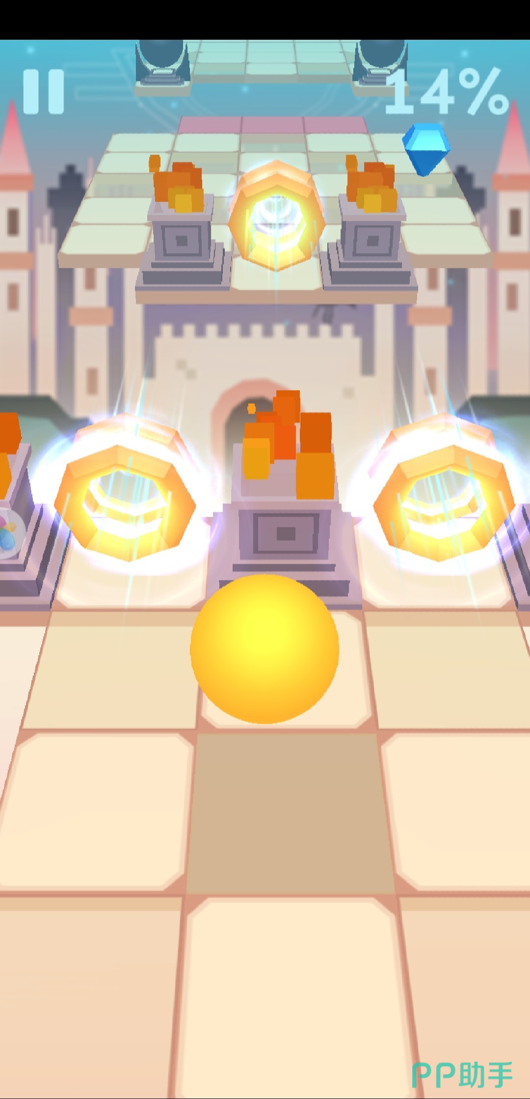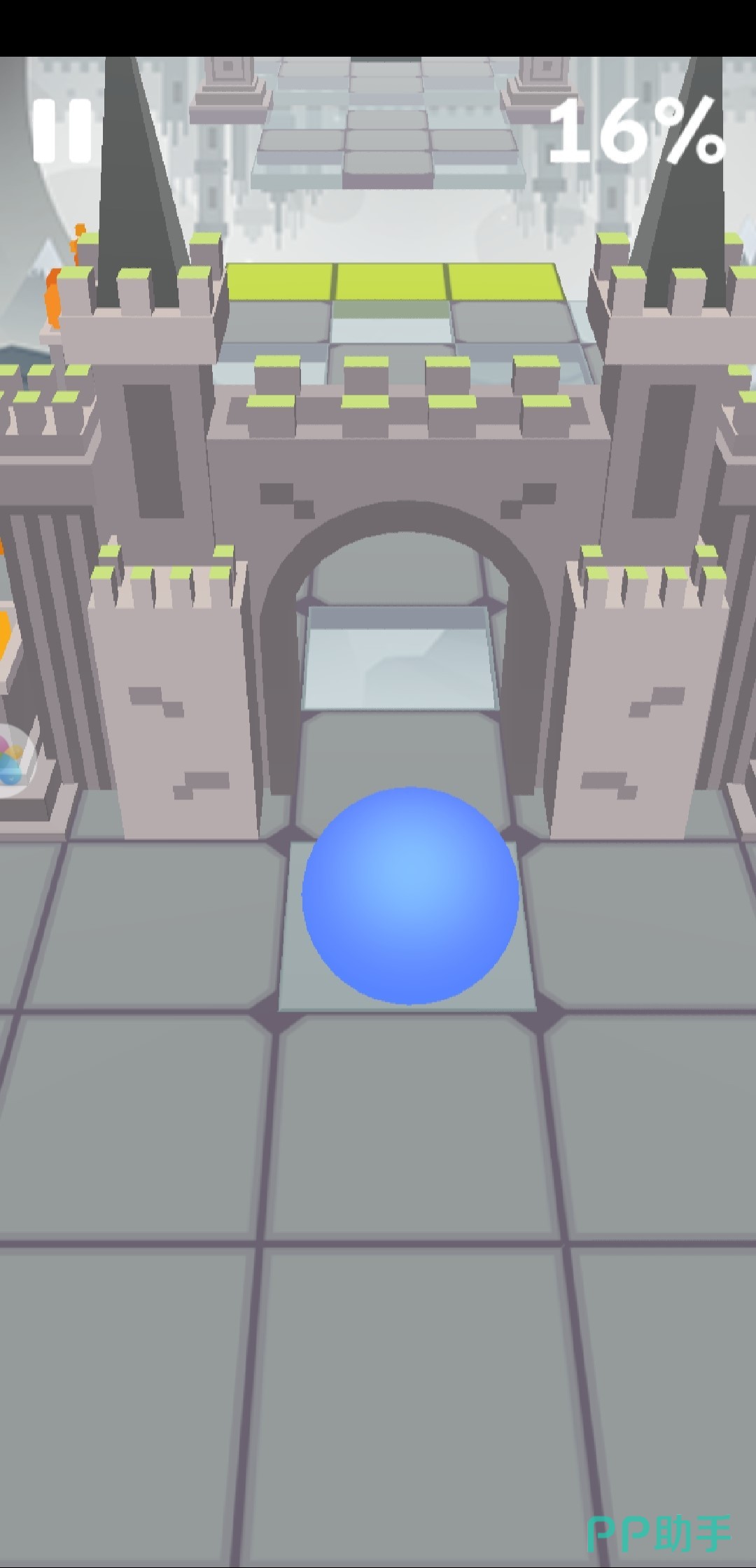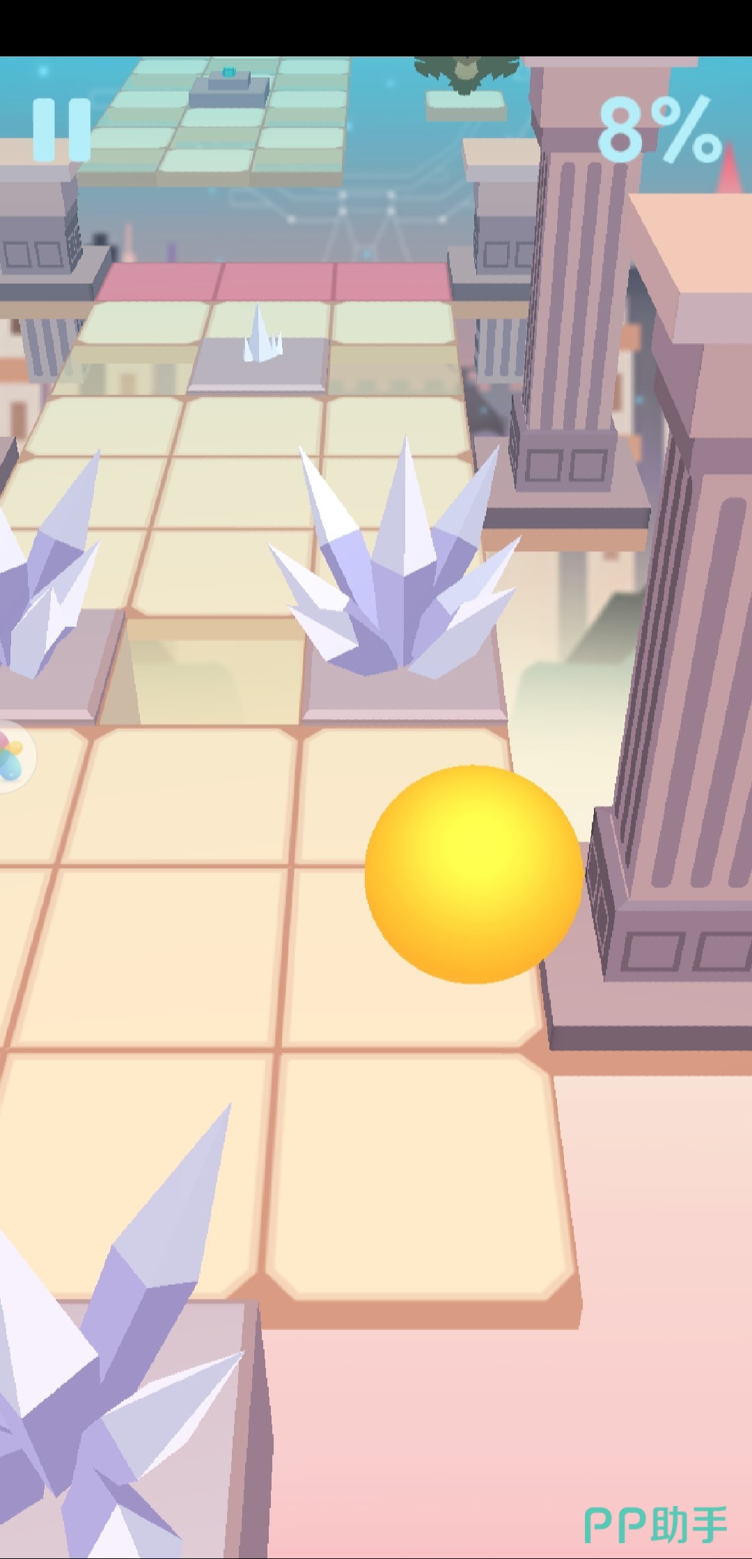 1、在游戏开始的时候,是比较简单的,但是需要注意的是,必须点击粉色的那个方块路,才能让滚球跳过去,才能通过那百分之一的路程。