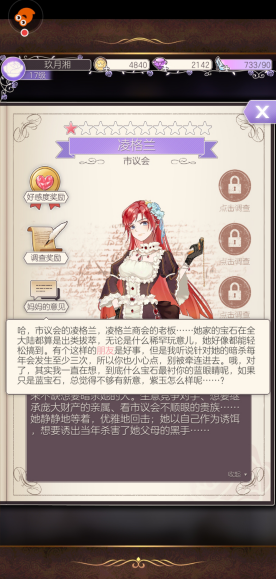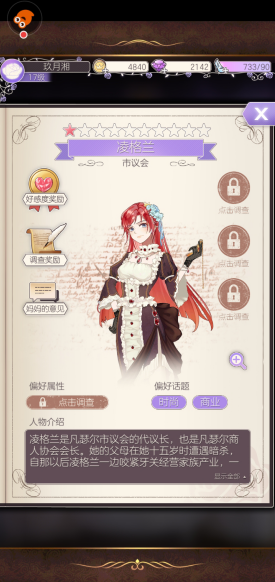 好感度问答方面过了的话,一般星星的数量都不会少于两颗星,两颗星就代表你跟她已经有一段感情了,这个时候可以主动的去找凌格兰聊一些话题说不定就在聊的过程中能给你透露了很多情报呢,所以话题方面小编建议尽量要避开政治类的话题,因为凌格兰是个商人所以我们可以适当的聊一下商业与时尚的话题,让她对你感兴趣起来。