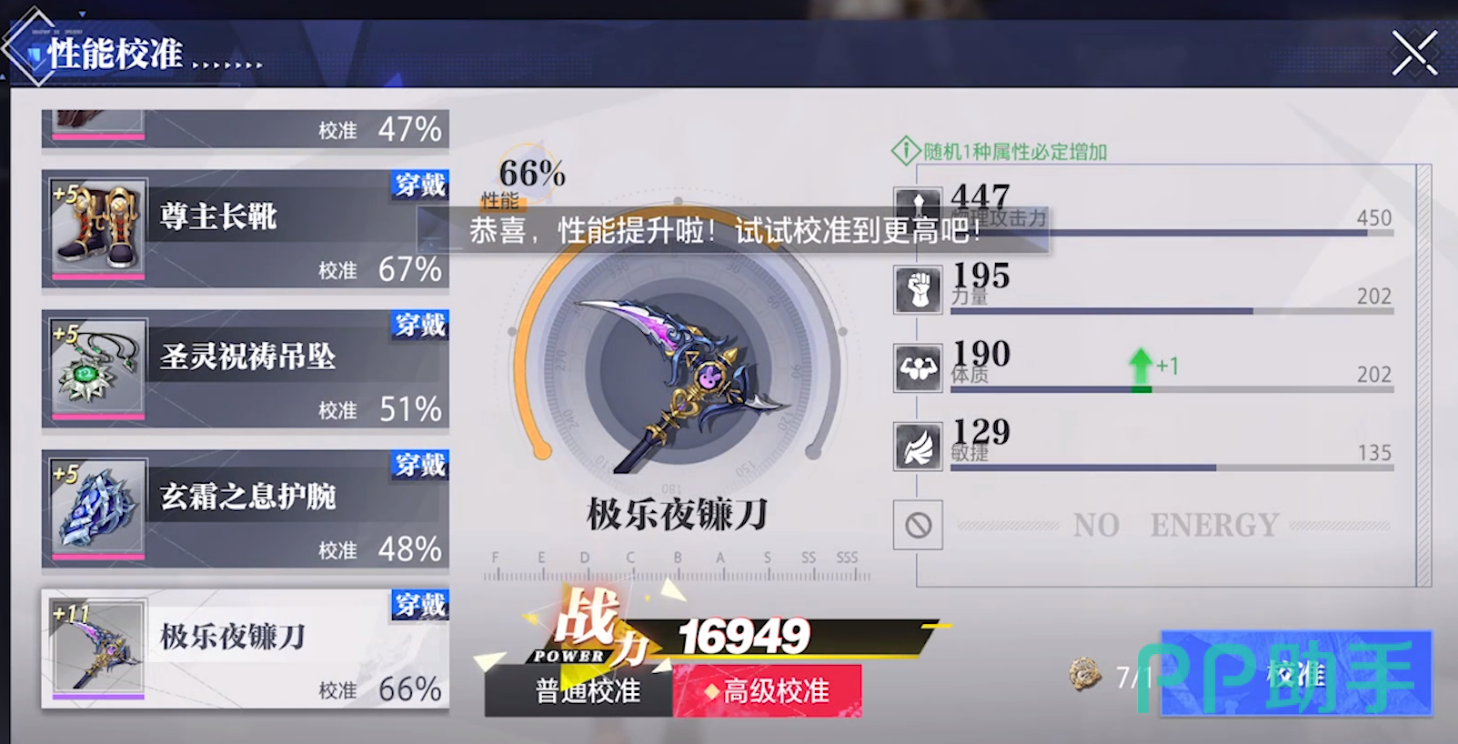在装备的强化界面可以找到校准这个界面,主要强化装备的四个主要属性,这四个属性和玩家的战力紧密相连,成功之后直接会显示玩家战力上升,相反失败就会下降战力。