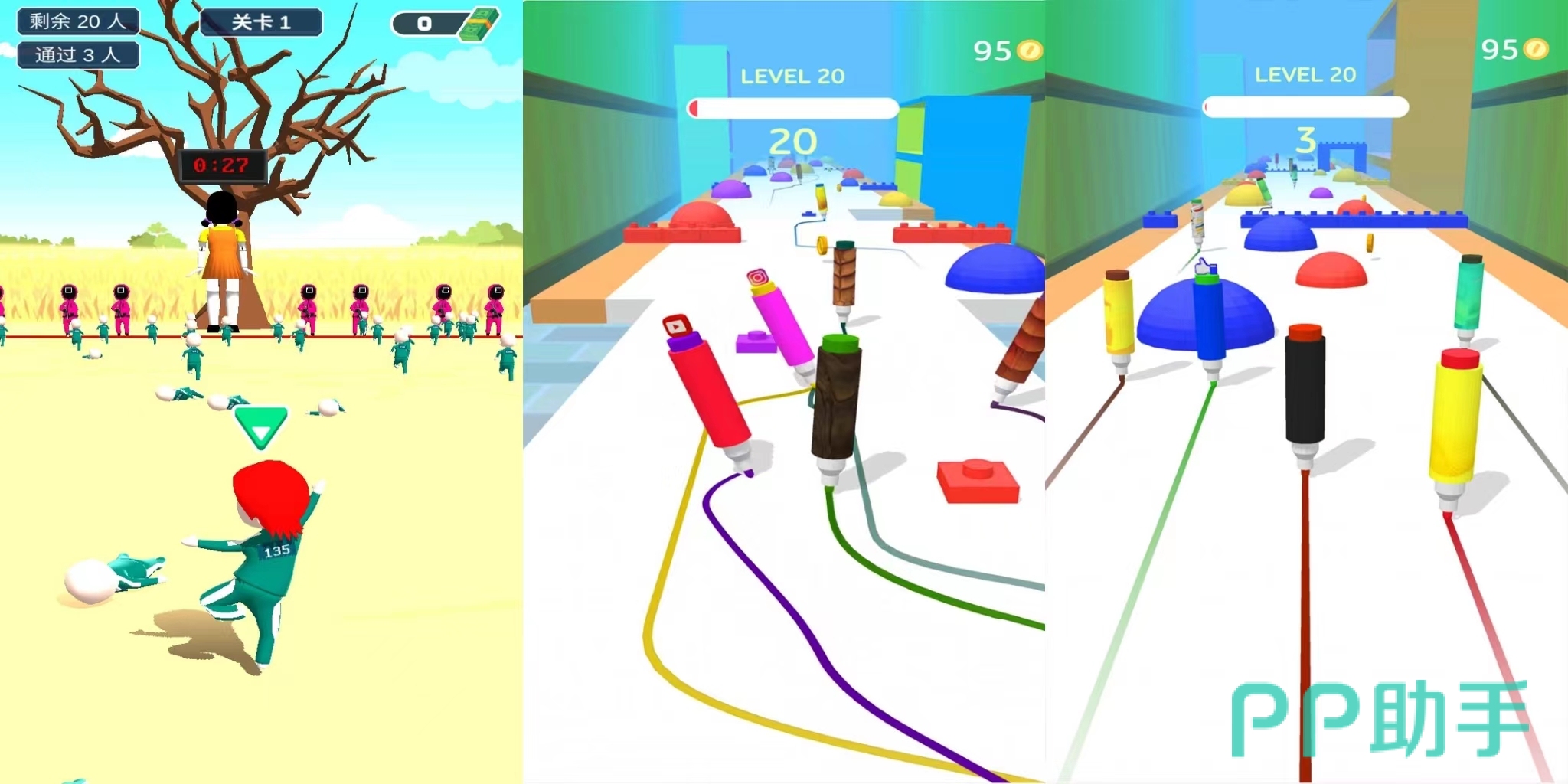 本作是一款卡通风的2D跑酷游戏。游戏有冲呀彩笔君和冲啊木头人两种游戏模式,两者都是紧张刺激的冒险闯关设计,玩家们需要认真遵循鱿鱼游戏的设定,把其他玩家甩在身后,领先众人,成为top1才能取得最终游戏胜利。