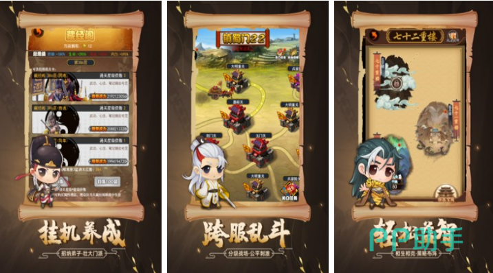 这是款有着卡通画风的回合制武侠手游,玩家们的身份是一个门派的掌门人,需要好好经营自己的门派,并跟一些达官贵人搞好关系,还需要派遣自己的弟子跟其他门派的人战斗,通过比武可以为门派赚更多的钱。