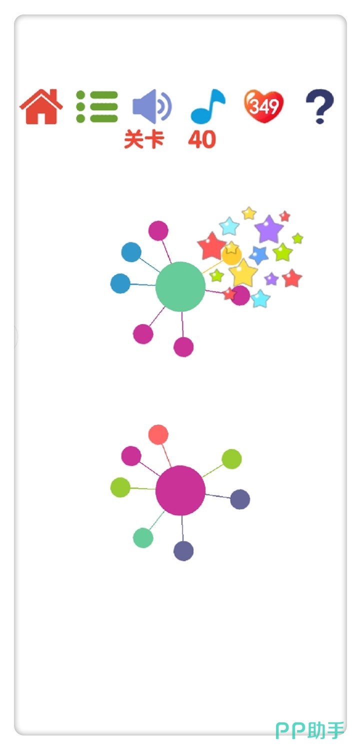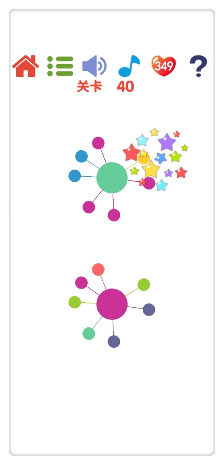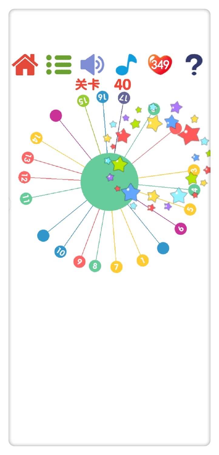 3、两个圆盘都是顺时针旋转的。下图一就是见缝插针第40关玩家开始游戏前的页面,图二就是玩家完美的通关后有小星星的页面。