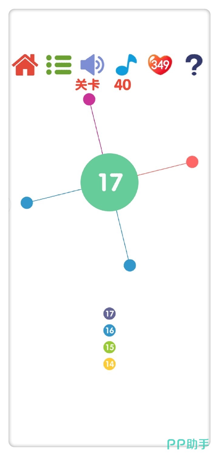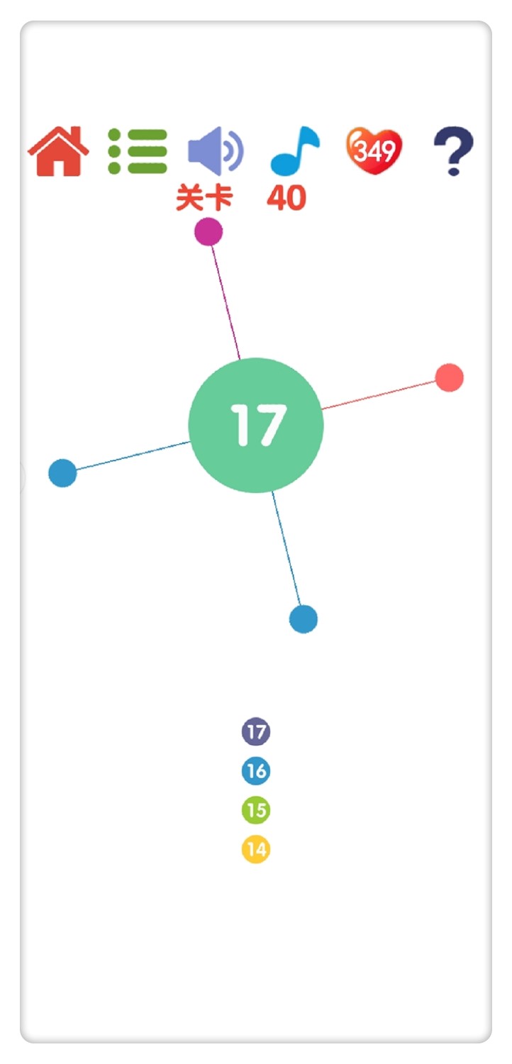 1、见缝插针经典版第40关在游戏开始前,圆盘上会有4根彩色的针,在旋转的圆盘下方会有17根针需要玩家射击到圆盘上。