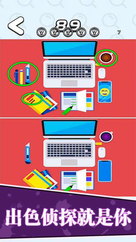 这个游戏内有500多张精美图片,画面色彩鲜明,美术是欧美卡通的风格,即使长时间看着屏幕找不同,也不会累到眼睛。玩法也很简单,玩家点击挑战关卡,然后对比上下两张图片有什么不同的地方,比如颜色、数量、摆放方向的不同,仔细从左到右横扫就能发现不合理的地方,快下载游戏挑战一下吧。