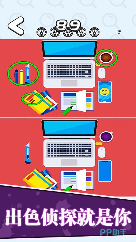 这个游戏有q版萌趣的画面,玩找茬类型游戏最担心的是画面乱七八糟,而这个游戏的物品场景线条简洁有序,在观感上很清爽。这个游戏主题以主人翁宅家生活为背景,有几十个关卡,玩家需要帮助主角寻找道具,解决居家生活的难题。找出通关道具还能看剧情,阅读情节描述能帮助玩家更快找出场景里面不同的地方。