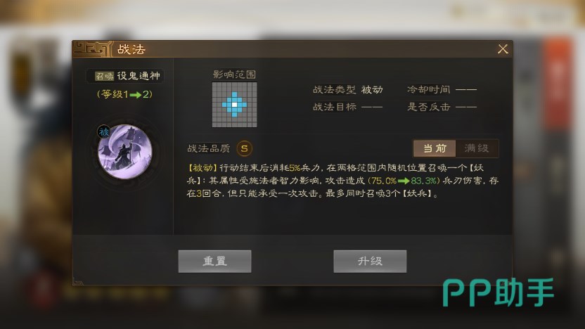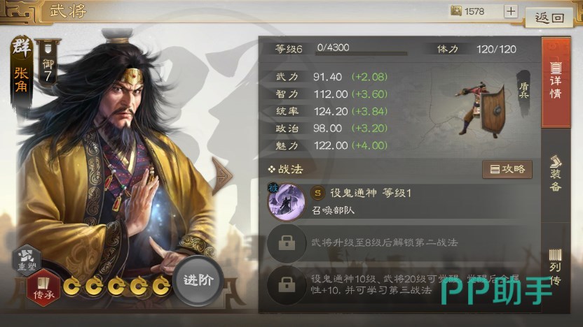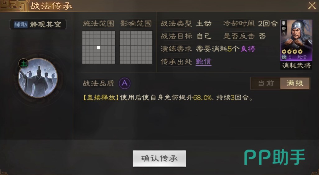 而且张角自身属性就很不错,第二个技能可以用鲍信的“静观其变”,最高可达68%的减伤,虽然只有前3回合生效,但能极大提升张角的坦度,让他有足够的时间召唤出小兵单位。