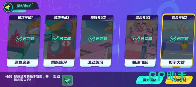 相比于新手、进阶和高级这三种派对券来说,超级派对券的难度确实很高,它一共有道具奔跑、跳跃练习、滚动练习、极速飞跃以及扳手大战五个派对考试关卡,依次通过后才能顺利完成。