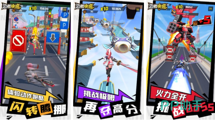 这款游戏中有很多帅气的女性忍者哦,这些小忍者会使用忍者刀劈砍道路上的障碍物,所以遇到了一些障碍物也并不用躲避,但是道路上的一些大坑还是需要跳过去的。这款手游里会出现很多机器人boss,玩家必须击败这些boss才能继续前进,在遭遇boss的时候可以捡起一些飞镖道具,使用飞镖就可以对boss造成伤害。