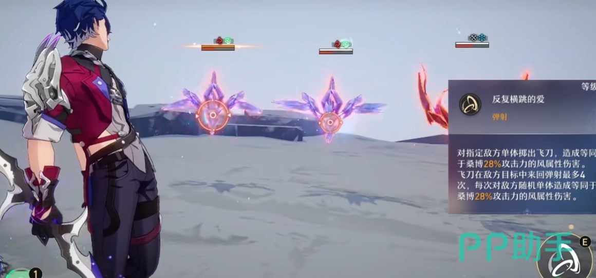 桑博以单体输出为主,战技能投掷飞刀对在敌人之间来回弹,本身攻击命中敌人会挂一个风化效果,持续掉血。通过各种行迹、星魂增强后,技能的负面面更广,持续伤害更高。