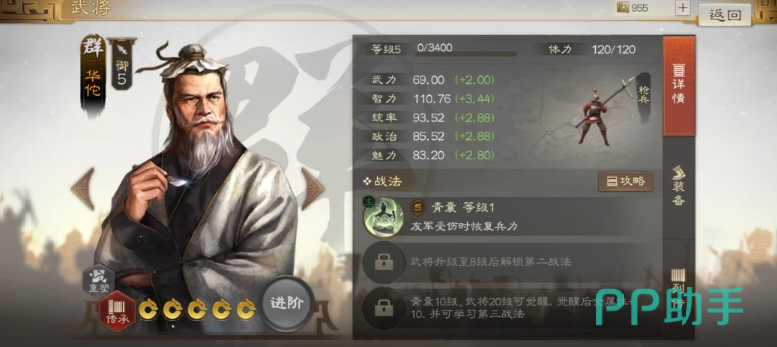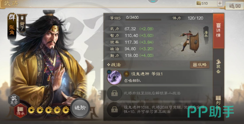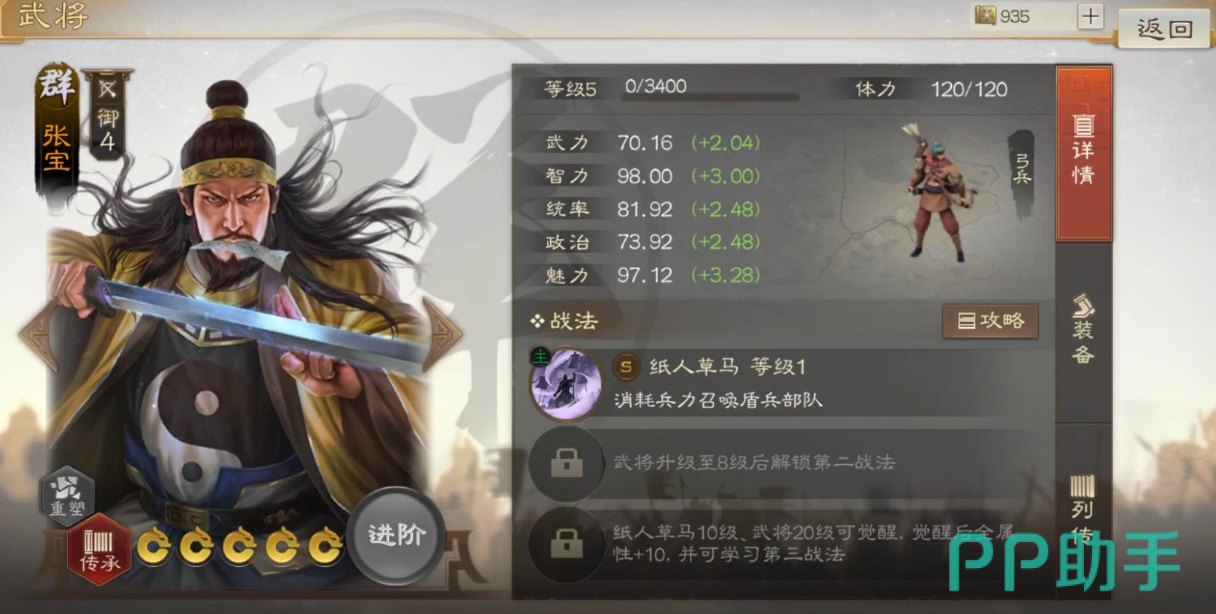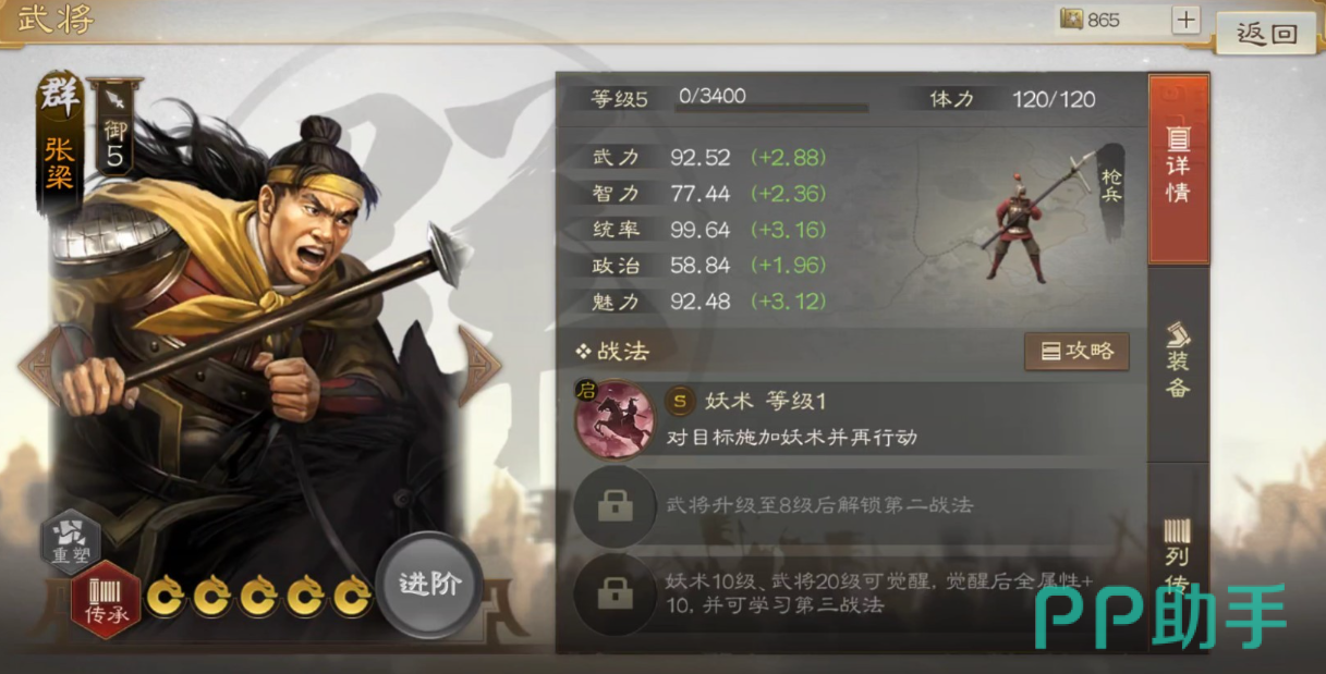 除了华佗的治愈上面的张梁其实是一个输出的定位武将,这个武将在上面可以带来降低对面移动力的战法,这个战法造成的额外伤害其实还是不错的,然后就是张宝,这个武将也是一个召唤型的,可以召唤盾兵帮助作战,而且持续有六个回合哦。