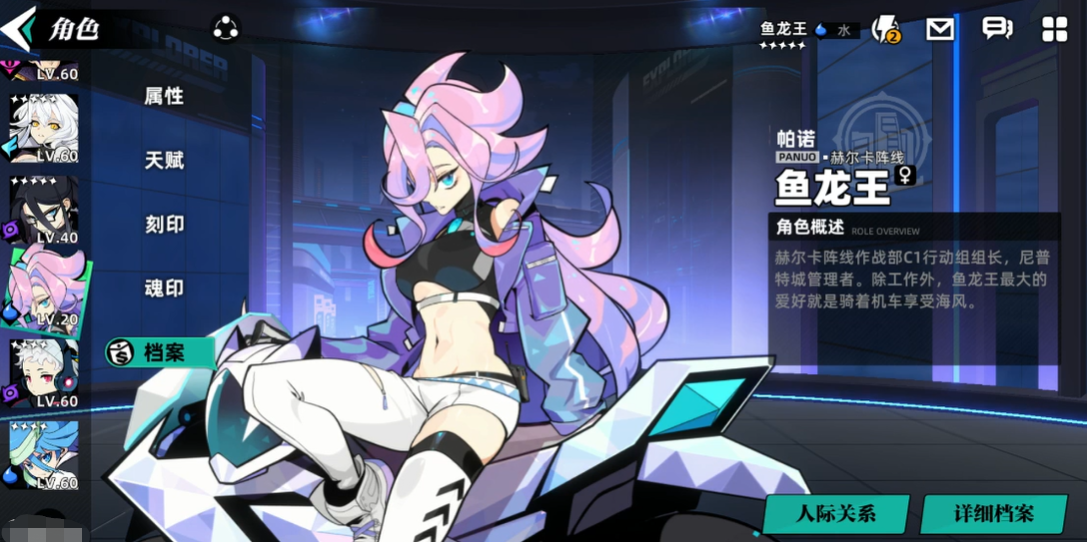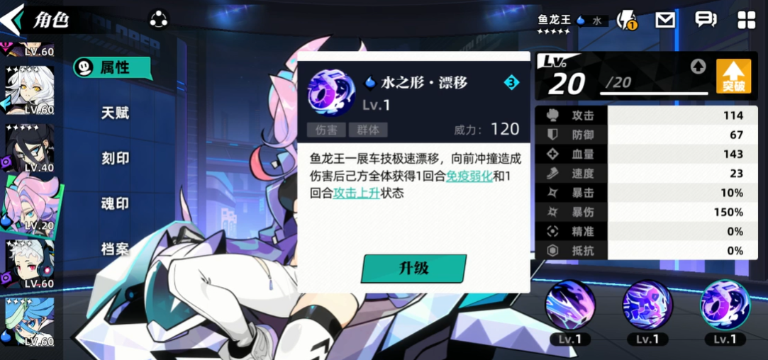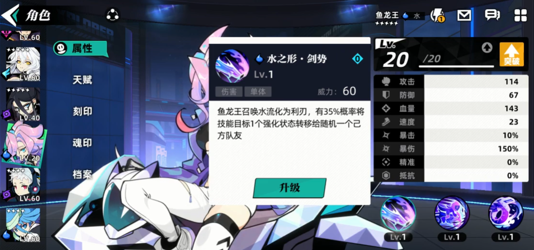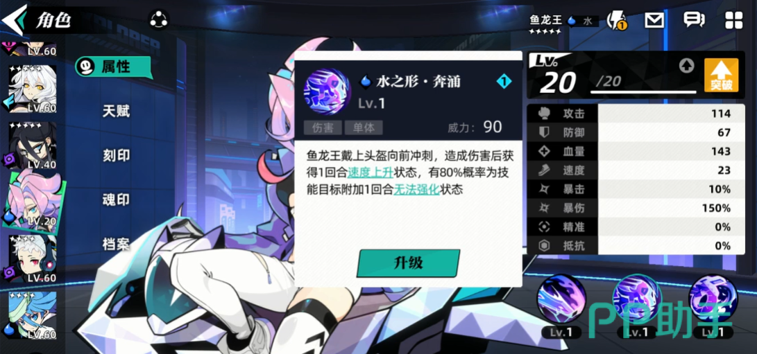 鱼龙王是一个女性角色,也是水系角色中的一个,一技能是一个使用水系效果的技能,召唤出来的水会变成利刃的形状进行攻击,攻击成功有一半的几率可以让对面的强化状态转移到己方一位成员身上,要是大家想要这个几率提升的话,可以进行角色升级。