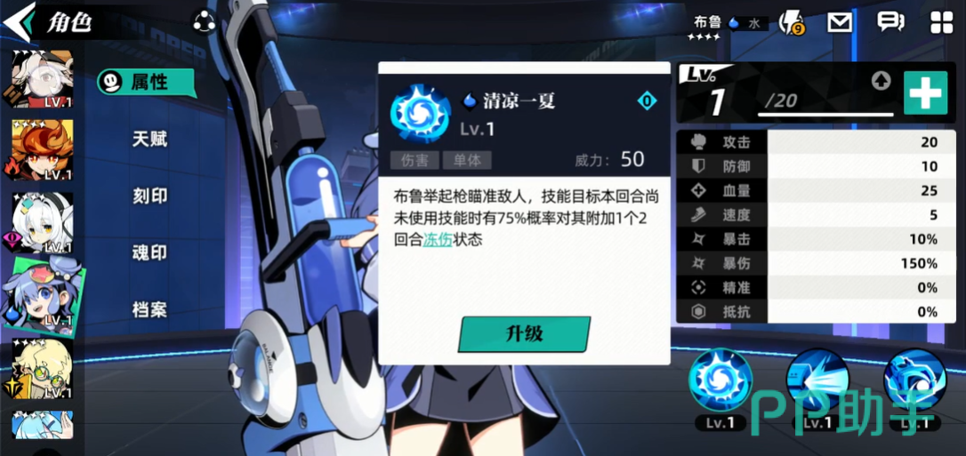 作为水系的一员,在技能上面布鲁自然也是带来的水系技能,造成的属性伤害不算高,但是在前期没有五星角色的时候算高的,一技能清凉一夏是一个伤害技能,给敌方单体造成威力70是伤害,威力数值比较普通,但是百分百的机会可以让对面进入冻伤状态,持续两个回合。