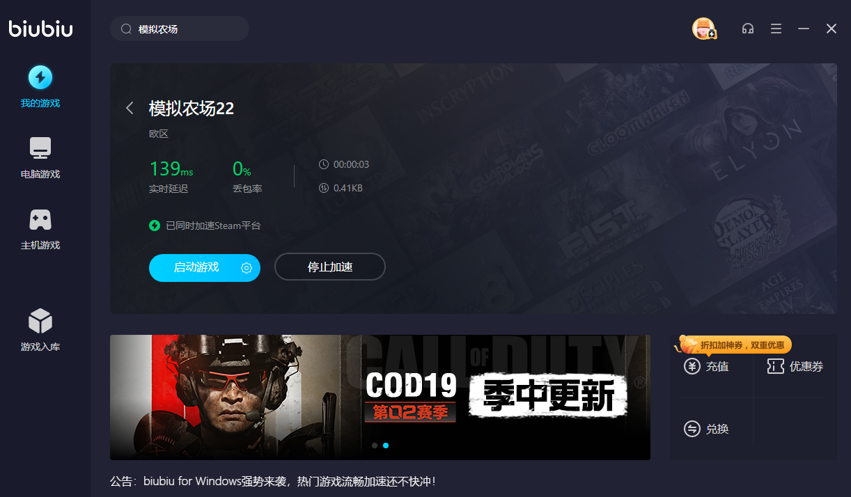 在模拟农场22的世界中,我们将扮演一名农场主,在游戏中进行驯化动物,喷洒农药等看似简单却很“折磨”人的农活,说它折磨,是因为模拟农场22采取了“布娃娃”物理系统,让模拟农场22的世界人物和动物移动起来十分抽象,实际操作起来更加抽象!大大增加了游戏的硬核程度,但是正因为它的硬核难度,当我们看到和朋友们一起搭建的农业帝国缓缓地迈向正轨,那股油然而生的成就感真是令人迷醉,小编认为,这也是它好评率这么高的原因吧!可是因为模拟农场22在大陆没有开国服的原因,导致对小伙伴们的网络环境要求颇高哦,小伙伴们也不想看到和朋友们努力24小时的成果,因为一次网络波动就顷刻间化为乌有吧!作为一名老“农夫”,小编在使用了biubiu加速器后就再也没有出现过这个问题了,下面就由小编来介绍下模拟农场22的网络波动解决方法吧!
