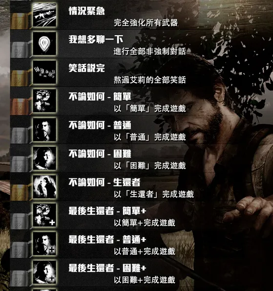 以上就是小编给大家整理的最后生还者重制版中文奖杯有哪些的全部介绍了,由于翻译问题可能与游戏中的名称有一些区别,不过大差不差,大家可以根据自己的需求完成这些奖杯达成的条件。好了,今天关于游戏的介绍就到这里,我们下期再见。