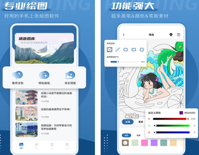 这个填色软件有强大的索套一键填色功能,用户可以在填色图库上选择像素填色、色彩搭配与填色画板。像素涂鸦填色有颜色数字提示,点击屏幕下方颜色填到相对应的数值即可涂色,即使是不会画画的新手也可以门槛上手画一幅动漫图。而且在临摹动漫图片方面也很方便,上传美图到这个软件,然后,用简易抠图功能圈出想画的部分,导入到软件里继续填色。更多有趣的玩法,等你来下载发现。