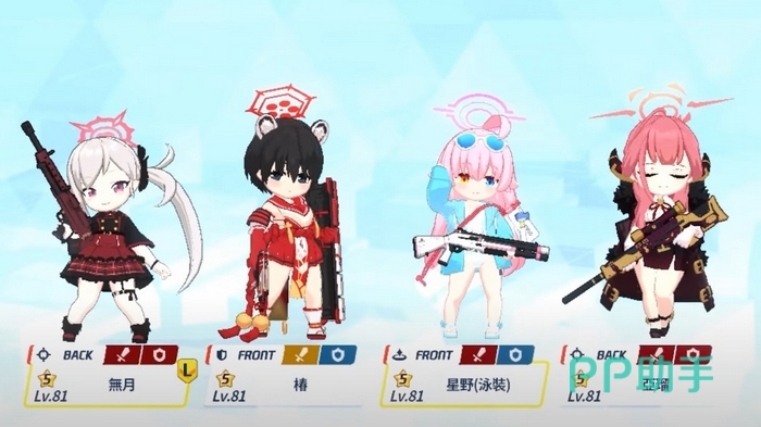 在游戏的主页面下面有个“编队”的标识,当然在进入每一关的战斗之前也可以调整队伍编成。一共可以设置4个编队方便里快速切换不同队伍来应对不一样的场合。队伍编辑完成后还可以通过点击学员头像前的“L”标识来设置一位队长,点击右侧的支援标识可以得到辅助成员给队伍提供的属性数值加成,主要是一些攻击、血量的加成。Front表示前排,Middle表示中排,Back表示后排。每个学员都是有各自的属性、武器种类,除此之外根据攻击伤害的方式还有以穿甲伤害为主的贯通、ex技能和小技能高伤害的爆发。在学员名字的前面会显示该学员的星级和等级,在上阵之前最好先看看能不能打得过,最好是与当前关卡相匹配。一个完整的队伍一般是由4个主力加2个辅助组成,一共6人队。PS:在编队的界面可以把角色SD小人拎起来哦!