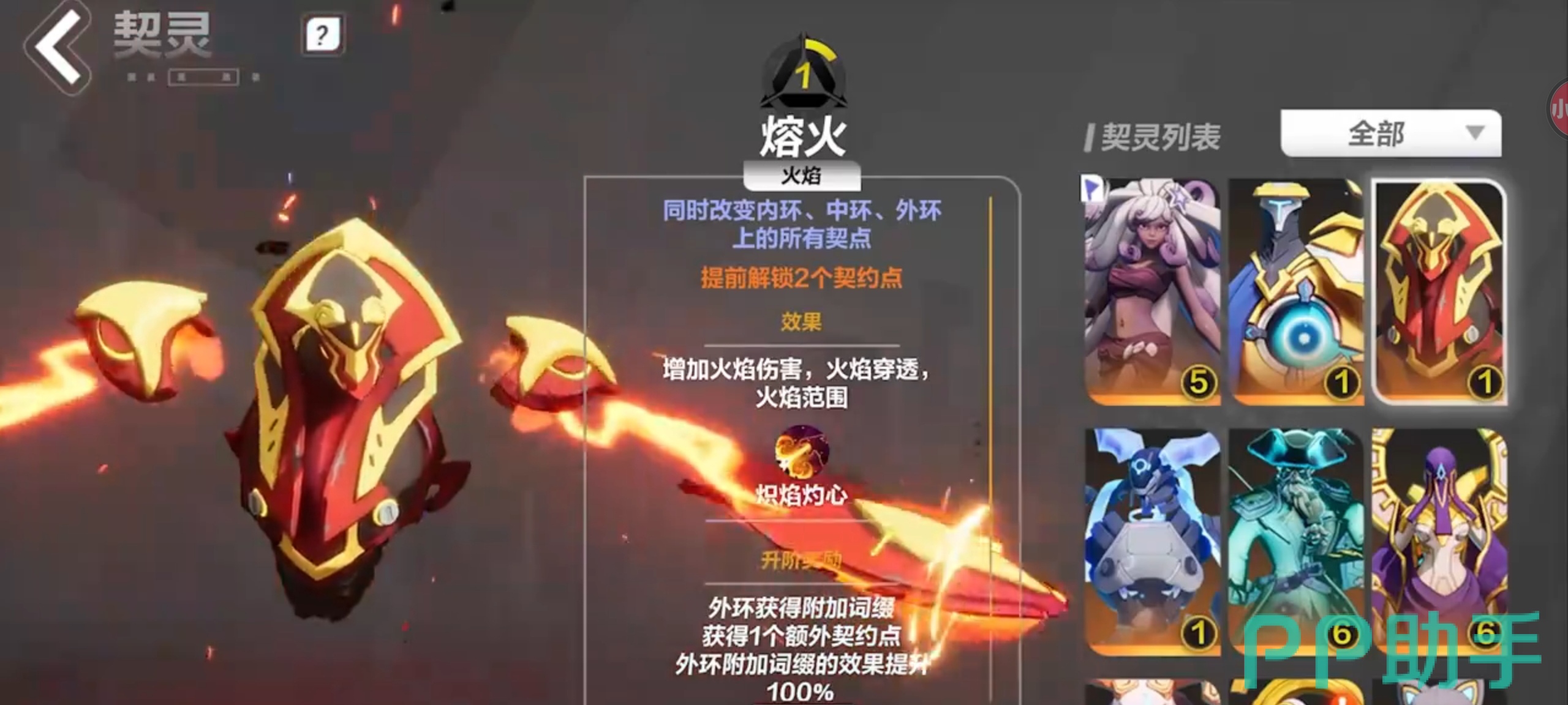 小编首先要推荐的是熔火,正如它的名字一样,长的非常像火焰的一个精灵,火属性角色可以使用。它拥有提高火焰伤害和穿透力的加成效果,还能扩大火焰的范围。如果玩家的专精为火法或类似火玩法的时候,比较推荐这个契灵,能全方位获得加成效果。