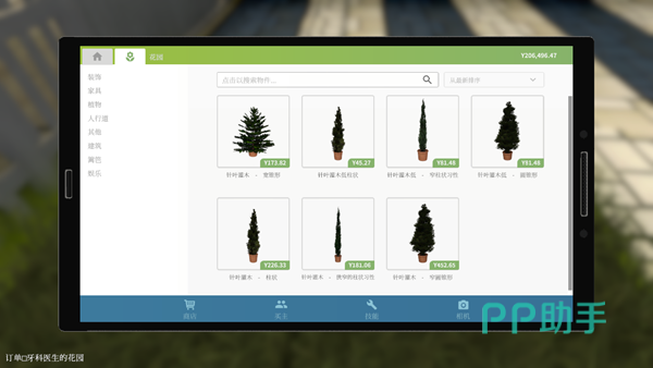 第二步建议大家开始种植树木,按Tab打开平板电脑,选择商店,切换到花园板块,在植物中找到针叶灌木或者是直接搜索针叶。搜索结果出来的七种应该都能管用,比较推荐使用第一个,毕竟便宜一些。在范围内适当位置点击之后按E互动,对着洞长按鼠标5-6次进行挖掘,按E插入植物然后再按一下在周围培土之后长按鼠标左键浇水就可以了。